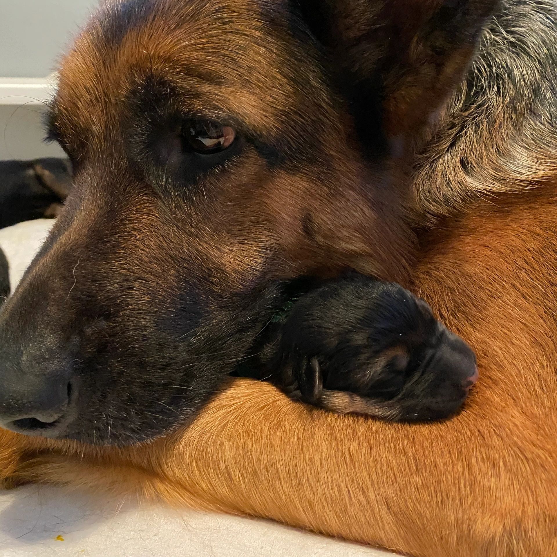 Sweet and exhausted Gucci in a tender moment cuddling with one of her newborn puppies ❤️